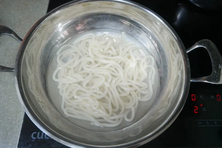 우동면은 끓는 물에 2분 정도 삶은 다음