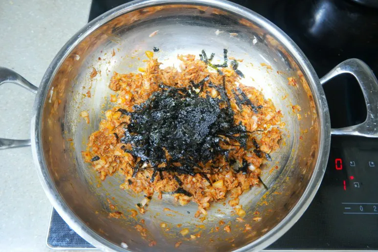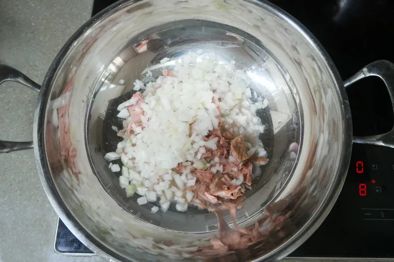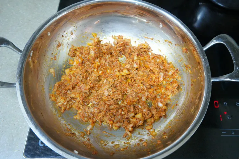 통조림 참치와 다진 양파를 넣고 먼저 볶아주세요.
