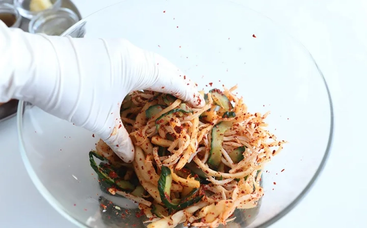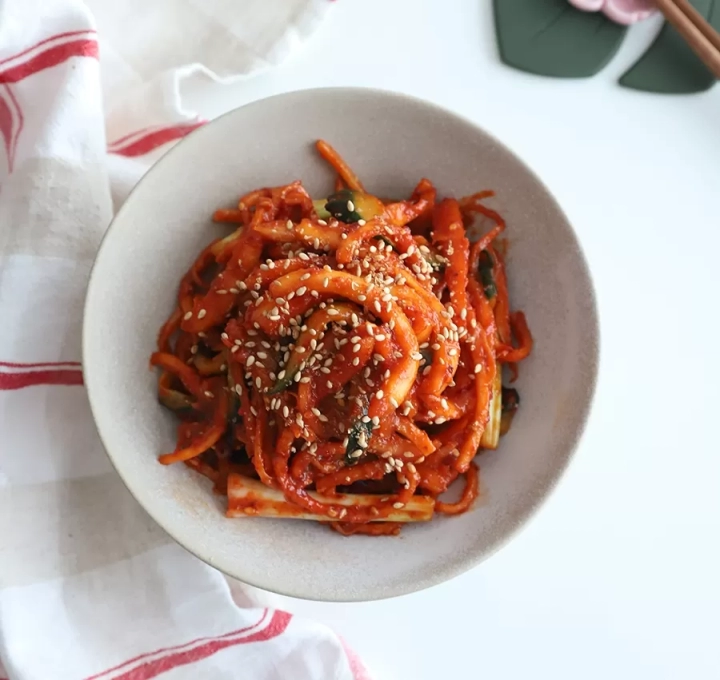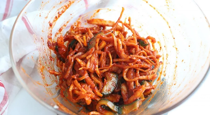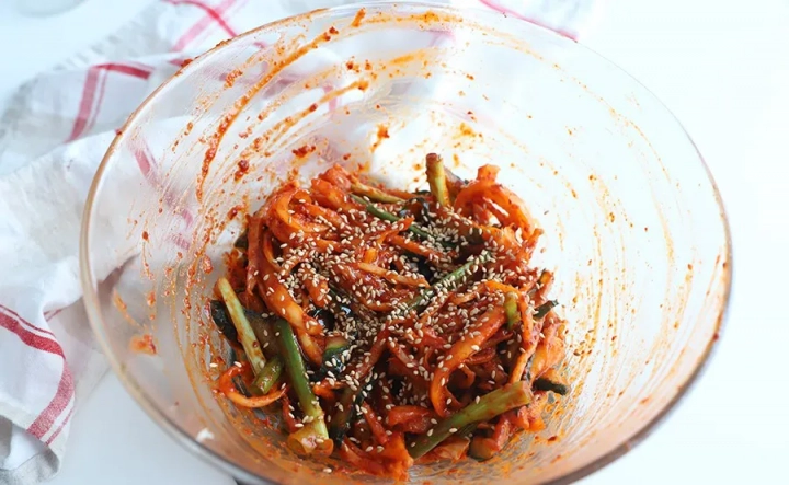 고춧가루가 겉돌지 않도록 먼저 2큰술 넣어 무쳐주세요.