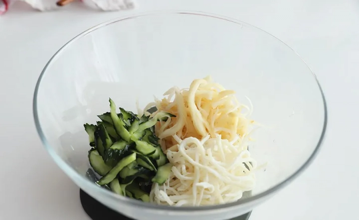 절인 오이, 도라지, 진미채를 모두 담아주세요.