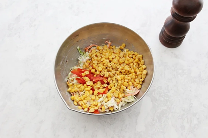 마무리로 파프리카와 스위트콘, 후추를 더해 살살 버무려주면 완성~