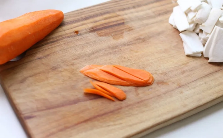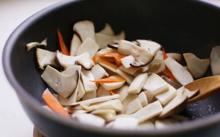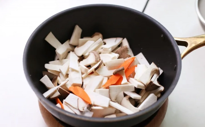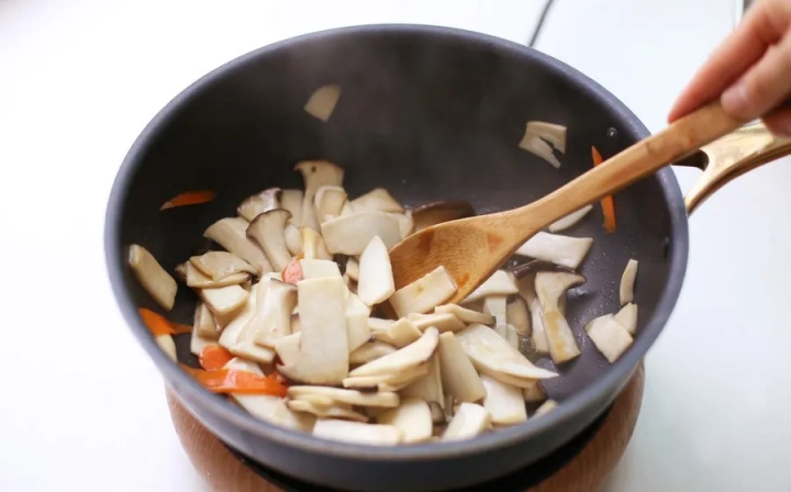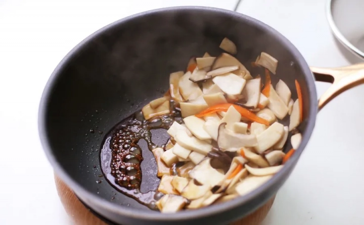 식용유를 두른 팬에 버섯과 당근을 볶아주세요.