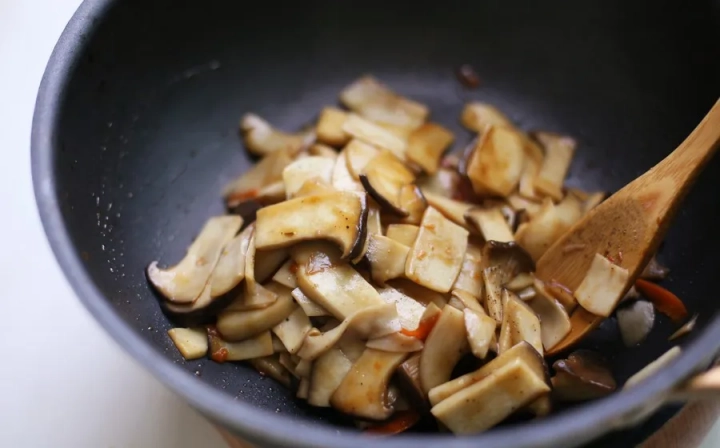 버섯에서 수분이 살짝 나올때까지 중약불에서 볶아주세요.