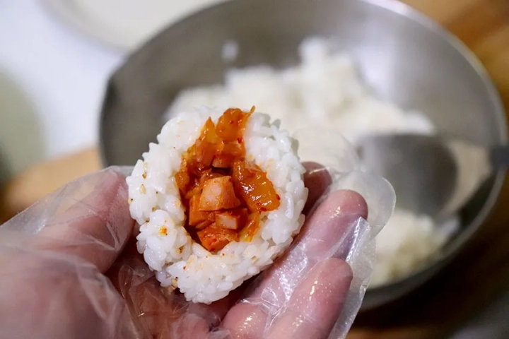 그 속에 볶아둔 스팸과 김치를 넣어주고 다시 동그랗게 만들어주세요.