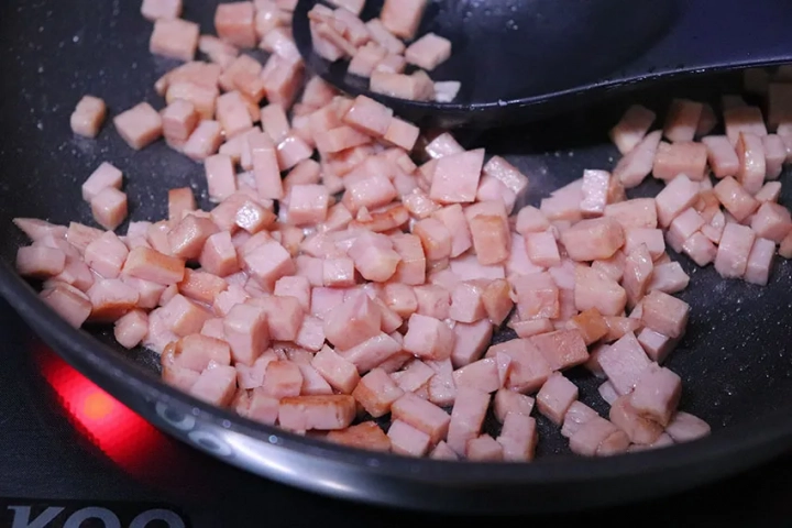 기름 두르지 않은 마른팬에 스팸을 노릇노릇하게 볶아주세요.
