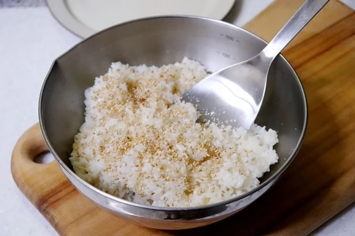 밥에 참기름, 소금, 통깨를 더해 밑간을 해주세요.