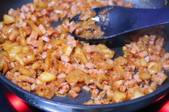 스팸에서 기름이 나오면 김치를 넣고 요리당 1큰술,