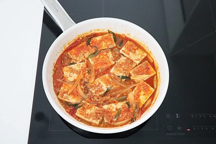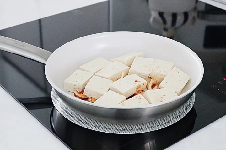 달군 팬에 양념장을 먼저 깔아주고 그 위에 두부를 올려주세요.