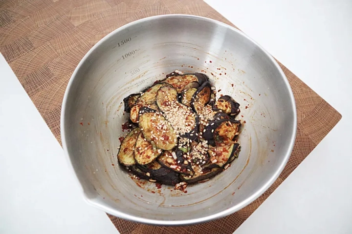 양념장에 가지를 조물조물 버무려주세요.