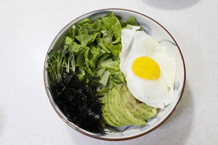 밥 위에 야채, 아보카도, 김가루 넉넉하게
