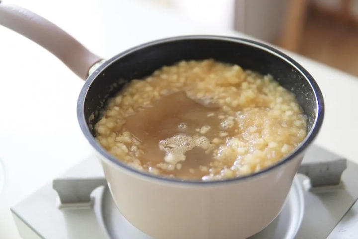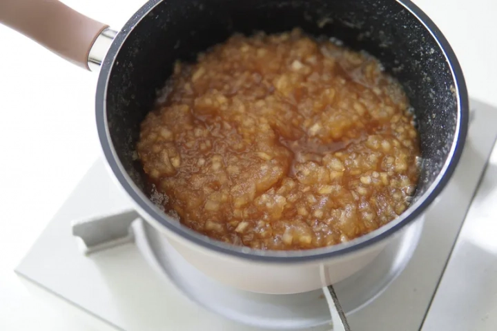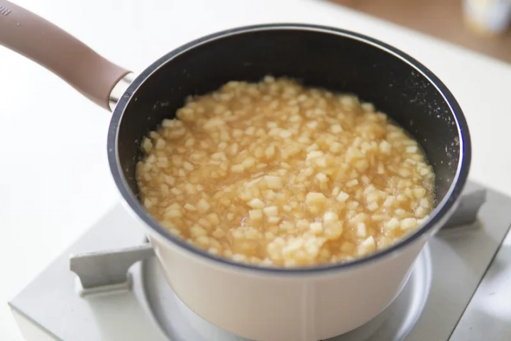 냄비에 사과를 담고 물 200ml를 붓고 중약불에서 20분 가량 끓여주세요.