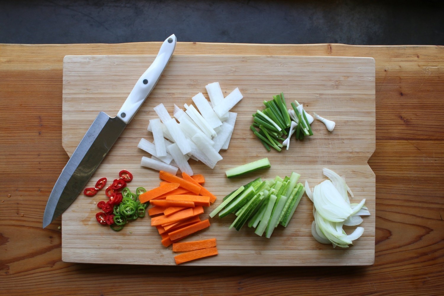 무 1/6개, 양파 1/4개, 청고추 1개, 홍고추 1개, 쪽파 약간, 통깨 약간