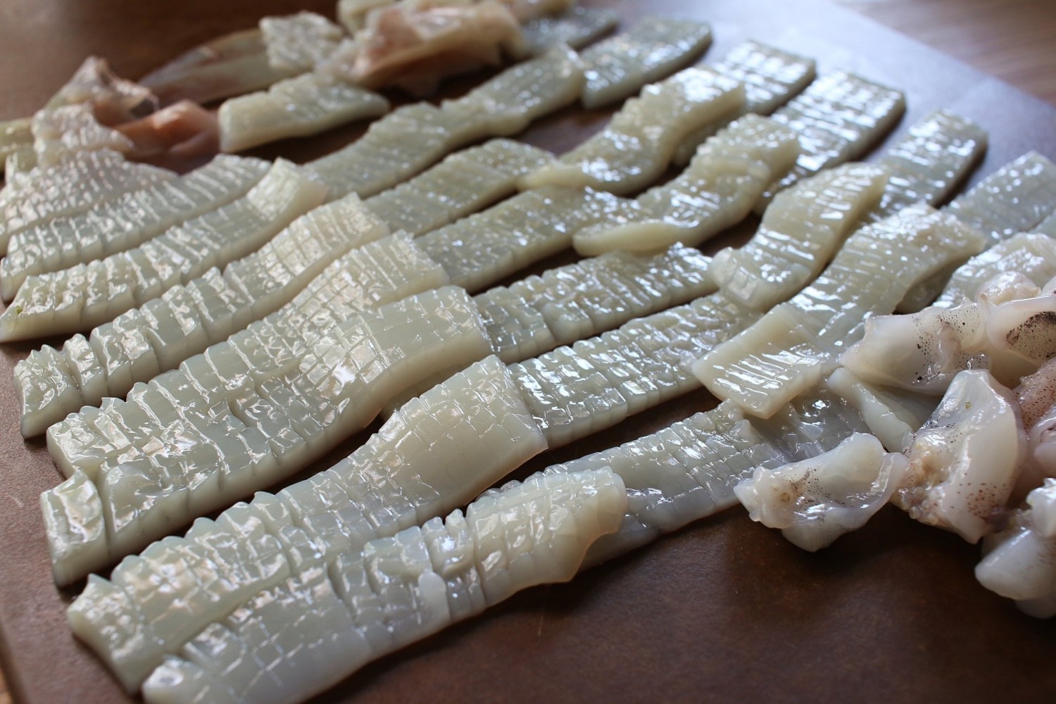 오징어는 껍질과 내장을 제거하고 칼집을 넣은 후 먹기 좋은 크기로 잘라주세요.
