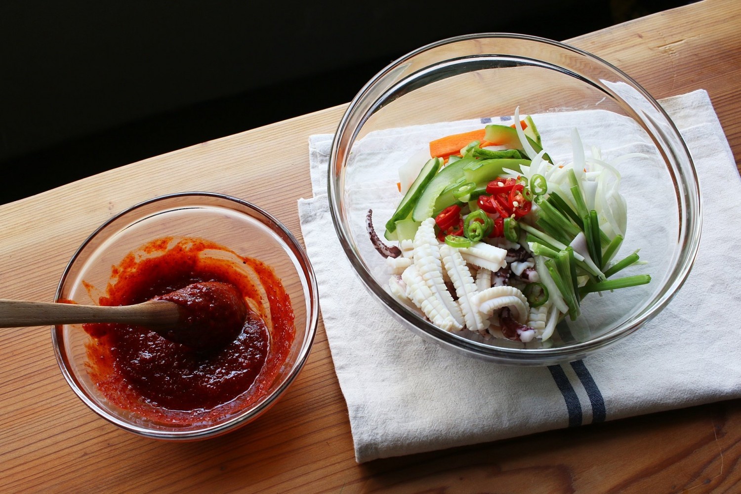 [양념재료]: 고추장 2큰술, 고춧가루 3큰술, 식초 2큰술,