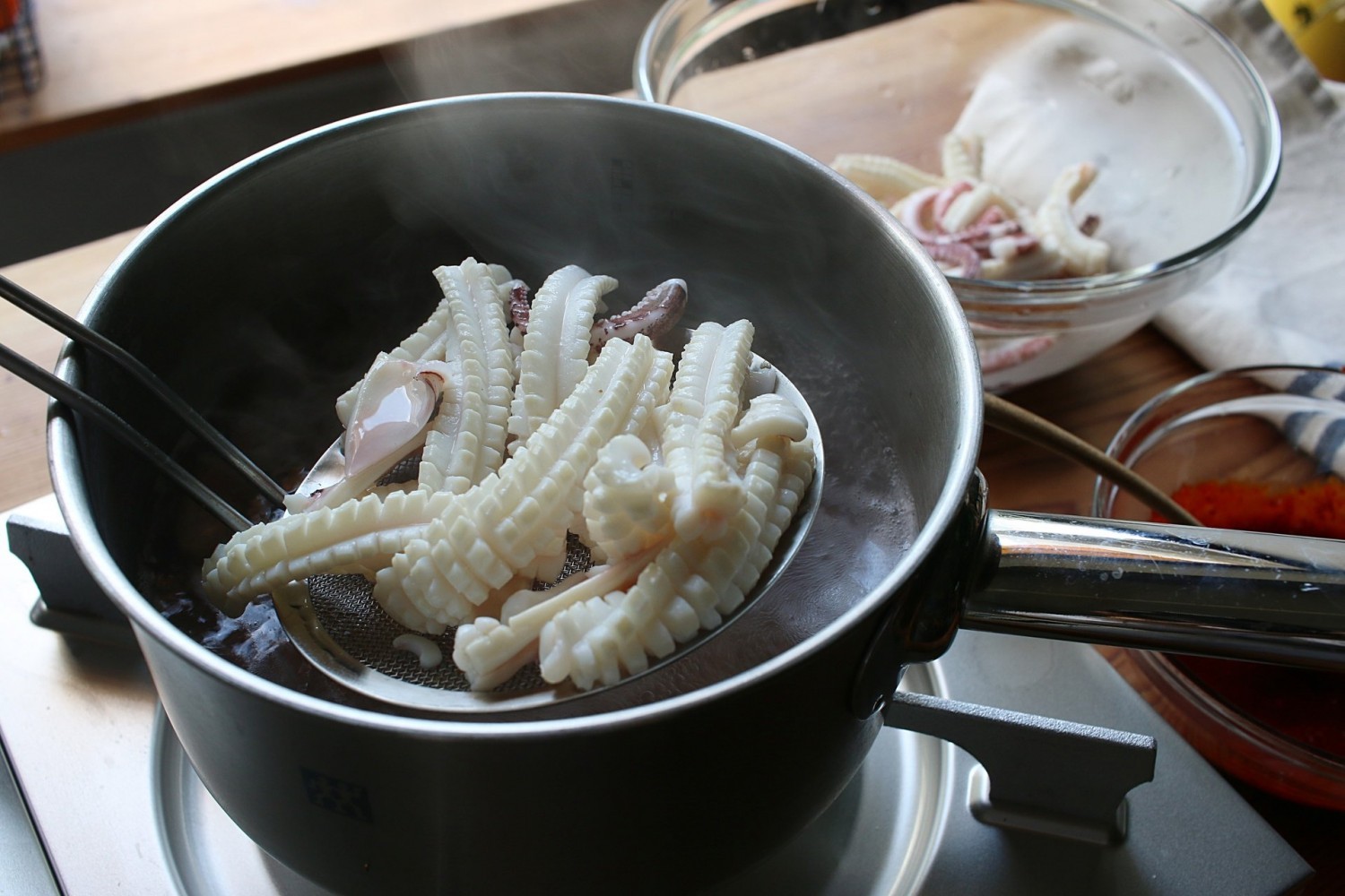 끓는 물에 소금 1큰술을 넣은 후 오징어를 살짝 데치고 체에 받쳐 식혀주세요.