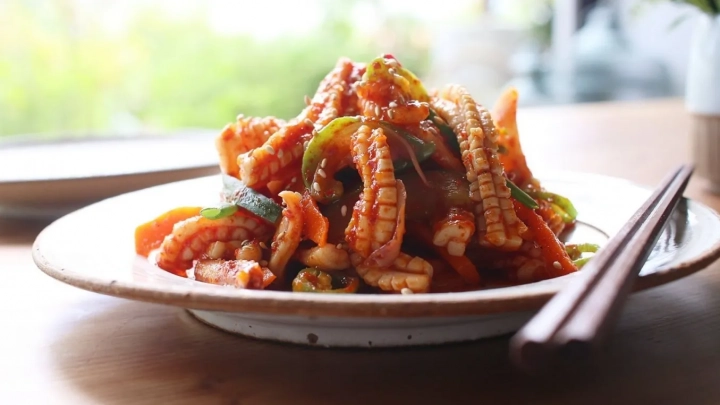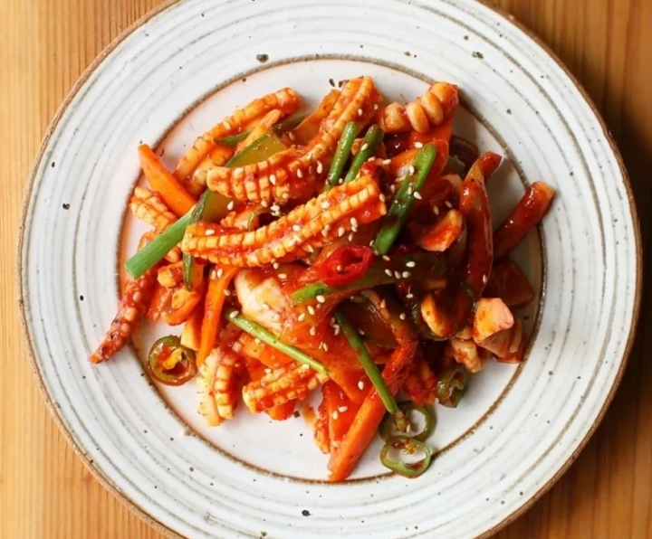 쫄깃한 오징어와 아삭한 식감의 채소를 더한