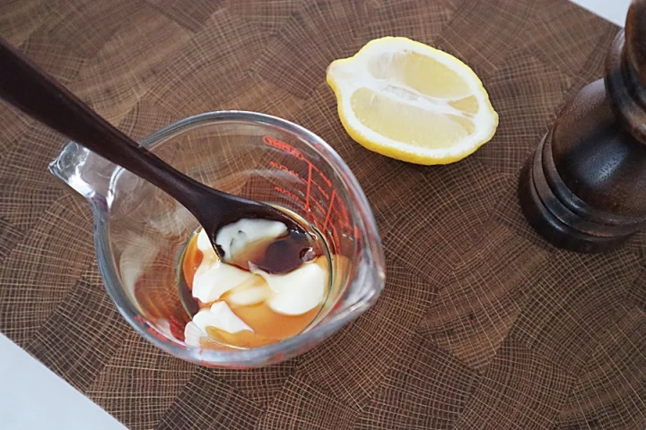 [마요소스재료]: 마요네즈 4큰술, 레몬즙 2큰술, 꿀 1.5큰술, 후추 약간