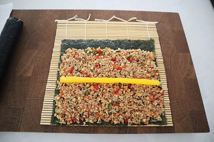 김에 밥을 올려 고르게 펼친 다음 단무지를 넣고 잘 말아주세요.