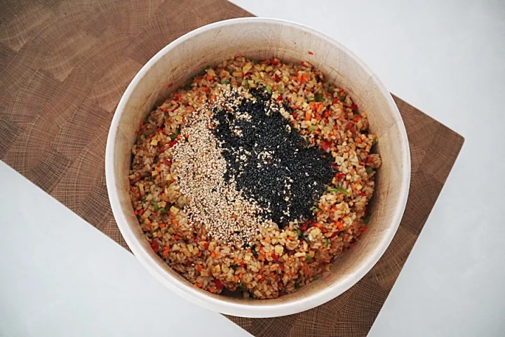 참깨와 검정깨, 참기름을 넣고 잘 섞어주세요.