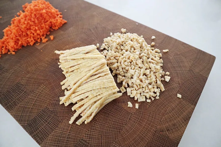 당근과 어묵을 최대한 잘게 썰어주세요.
