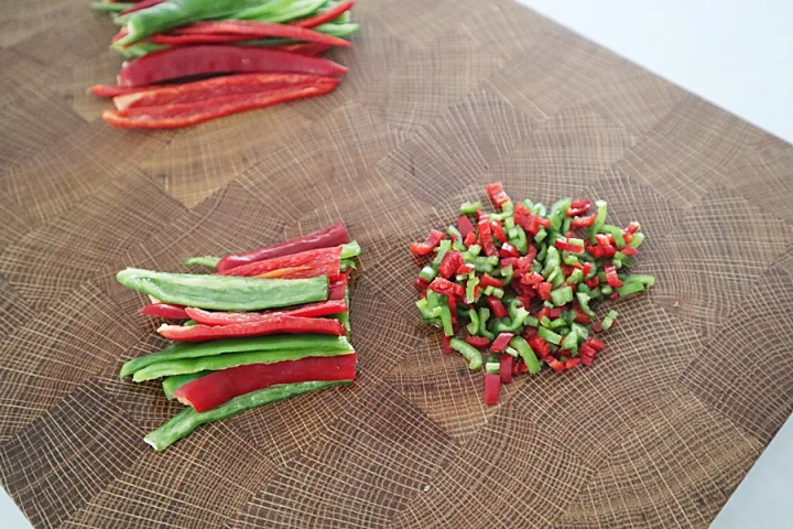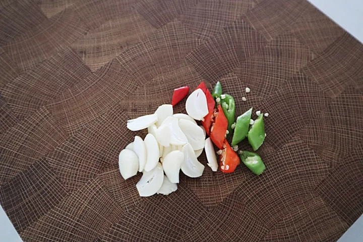 마늘은 슬라이스하고 청양고추, 베트남고추는 어슷하게 썰어주세요.