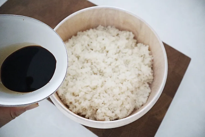 갓 지은 밥에 매운 간장소스를 넣고 잘 섞어주세요.