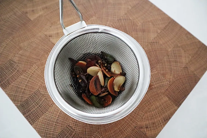 맛이 우러나게 냄비에 그대로 둔 뒤 체에 받쳐 간장만 받으세요.