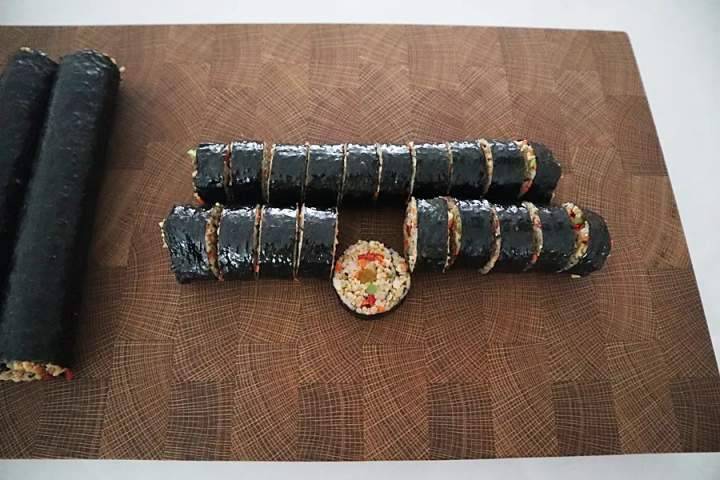 [재료]: 밥 4공기, 구운김밥김 6장, 김밥용단무지 6개,