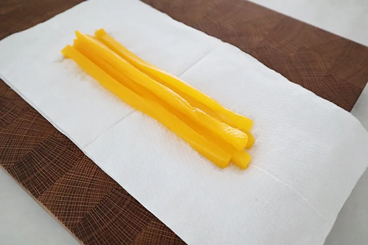 단무지는 흐르는 물에 가볍게 헹궈 키친타월로 물기를 제거해주세요.