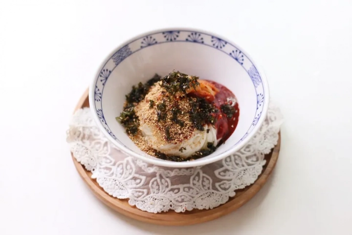 [재료]: 소면 100g, 김치 50g, 참기름 1큰술, 통깨, 김가루