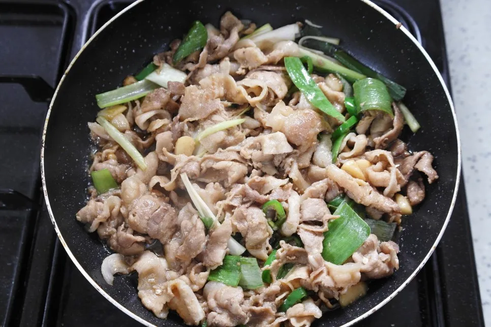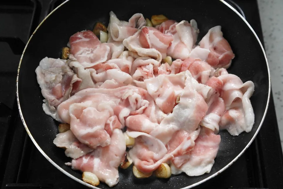 마늘 향이 올라오면 대패삼겹살을 볶아주세요.