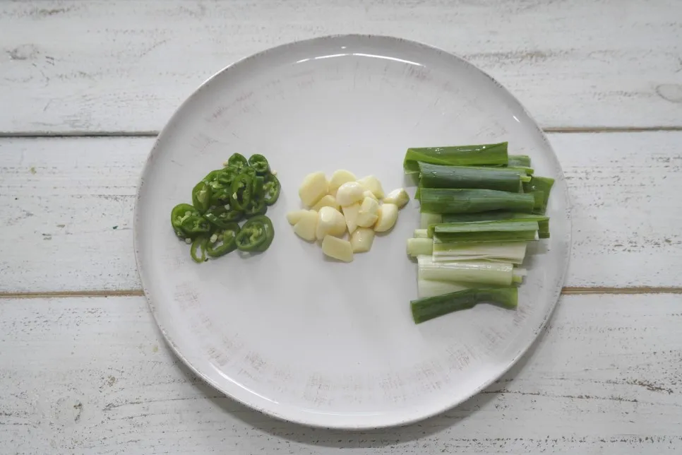 마늘 5개, 고추 1개, 홍고추 1개, 깻잎 5장, 참기름 1큰술, 깨 약간