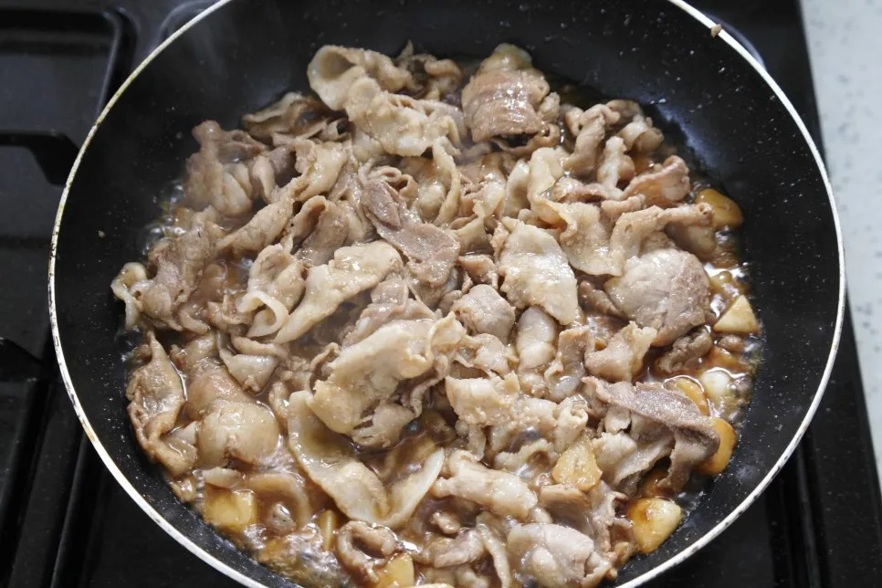 대패삼겹살이 절반 정도 익으면 간장 소스를 넣어 조리듯이 볶아주세요.