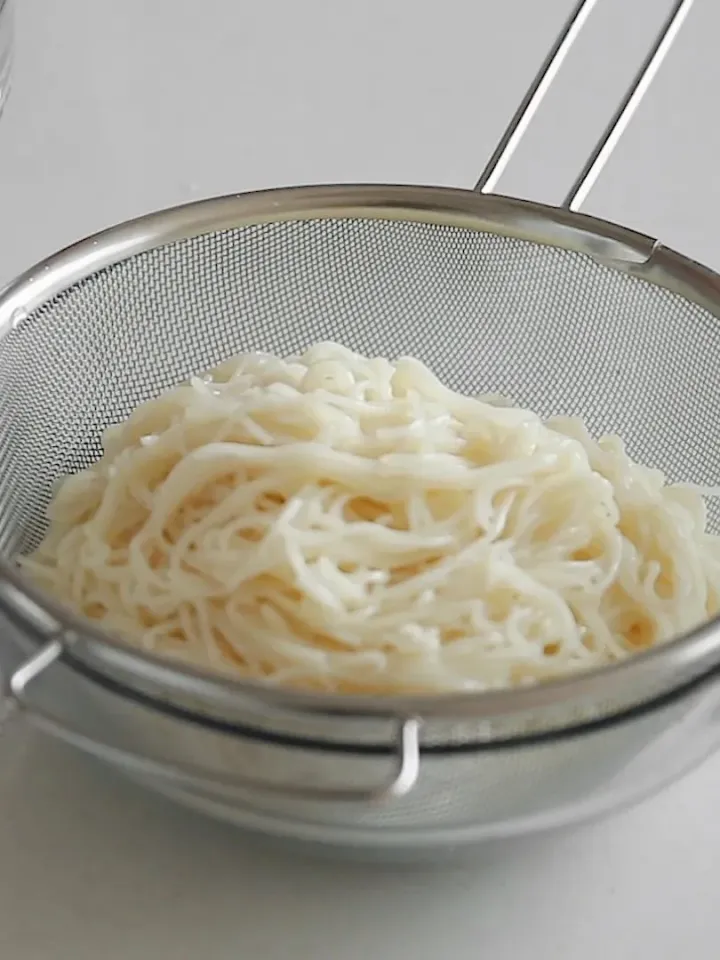 삶아진 소면은 찬물에 헹구고 물기를 제거해주세요.