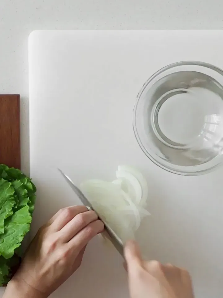 양파는 채를 썰어 찬물에 10분 정도 담가 아린맛을 제거해주세요.