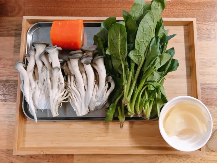 [재료]: 느타리버섯 120g, 시금치 한줌, 단무지 약간,
