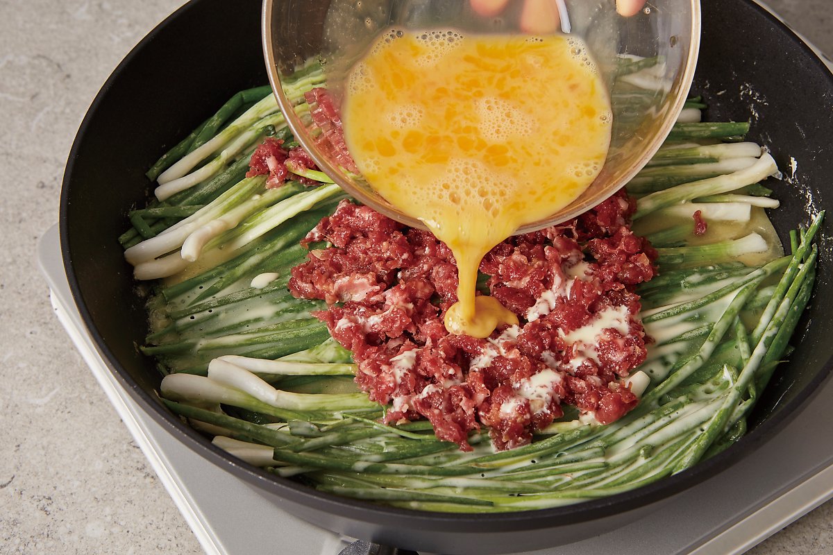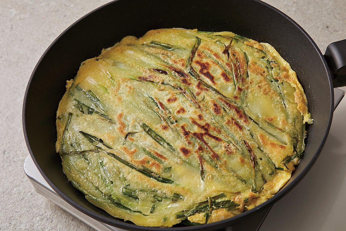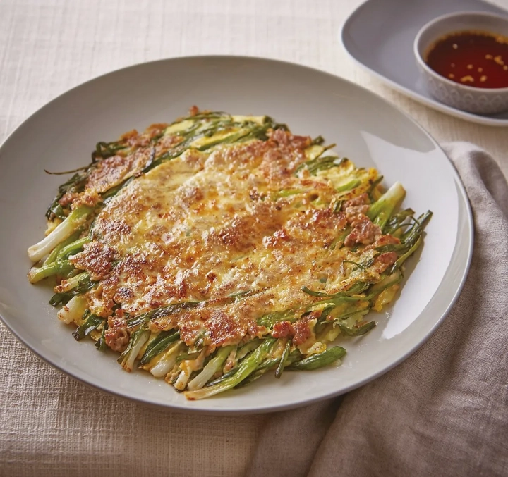 [재료]: 쪽파, 다진 소고기 100g,, 부침가루 1종이컵, 달걀물