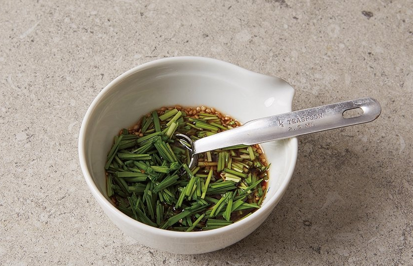 다진 마늘 1/3큰술, 다진 부추 2큰술, 부순 참깨 1큰술