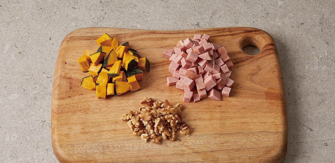 단호박과 햄은 한입 크기로 썰고 호두는 먹기 좋게 부숴주세요.