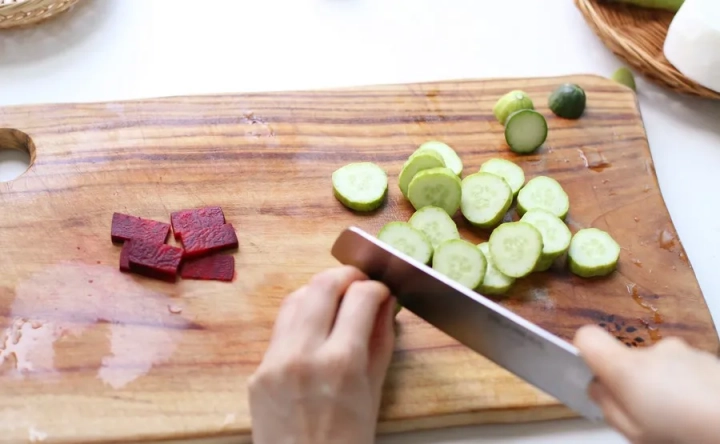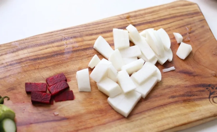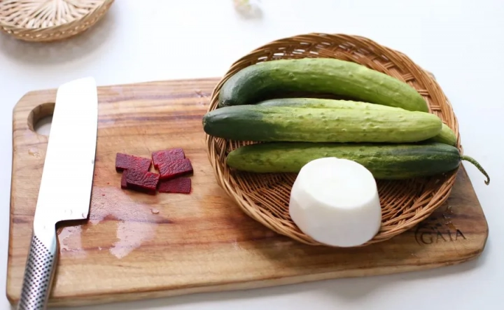 [재료]: 오이 4개, 무 200g, 레드비트 약간