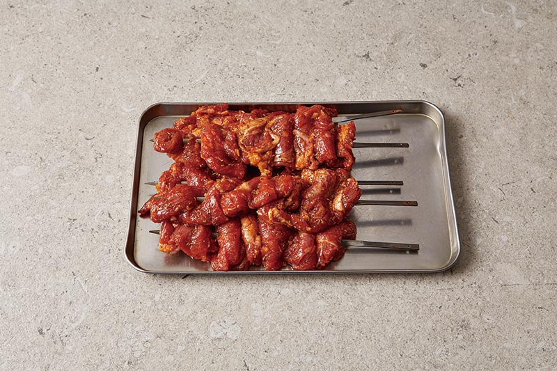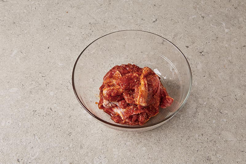 밑간 재료를 골고루 섞어 양고기를 30분간 숙성해주세요.