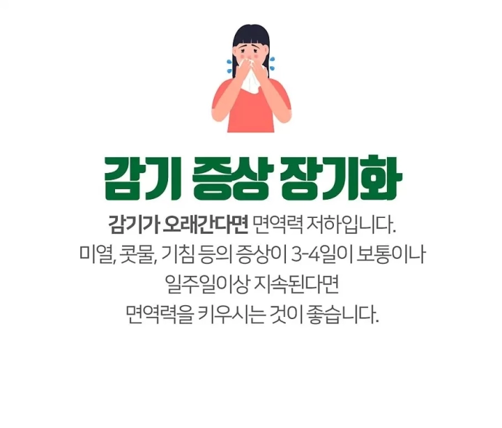 감기와 독감 등의 질병은 기관지에 영향을 미쳐 항체의 생성을 저하시키는 결과를 초래한다고 하는데요. 백혈구 부족, 순환기문제, 산소 포화도 저하 등은 감기와 독감에 치명적이라고 합니다. 면역력이 떨어지면 감기 바이러스가 몸에 쉽게 침투하고 따라서 감기에 잘 걸리고 증상이 심하며 잘 낫지 않는다고 합니다. 보통 감기에 걸리면 콧물, 기침, 미열 등의 증상이 3~4일 지속되다 사라지지만 면역력이 많이 떨어진 상태에서는 증상이 이보다 오래 지속되며 고열이 날 수 있다고 합니다.
