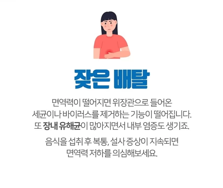 면역력이 떨어지면 위장관으로 들어온 세균이나 바이러스를 제거하는 기능이 떨어지고 장내 유해균이 많아지면서 내부 염증이 생길 수 있다고 하는데요. 따라서 음식을 먹은 후 복통이 생기고 설사를 하는 증상이 지속되면 면역력 저하를 의심해야 한다고 합니다.
