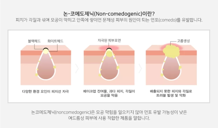 모공을 막아 여드름을 유발하는 성분이 들어있는 화장품을 코메도제닉 스킨케어 제품이라 한다고 하는데요. 피부를 보호하기 위해서는 필수적으로 논코메도제닉(non-comedogenic) 제품을 선택해야 한다고 합니다. 요즘 시대에서는 논코메도제닉이 산업 표준으로 널리 지정되어 있지만 모든 제품이 그런 것은 아니고 예를 들어 코코넛 오일은 대표적인 코메도제닉으로 일부 제품은 코코넛 오일 성분을 과하게 넣기도 하지만 어떤 사람들의 피부는 코코넛 오일과 같은 코메도제닉 성분으로 인해 모공이 막히는 부정적인 반응을 보이기도 하죠. 코메도제닉 성분이 불안하다면 '논코메도제닉'이라고 쓰여있는 제품을 사용하는것이 좋다고 합니다.