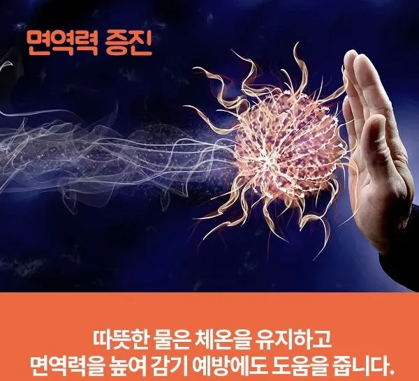 따뜻한 물을 수시로 마셔 정상 체온을 유지시 잔병이 없다고 하는데요. 체온을 1도만 올려도 우리몸은 이전보다 훨씬 면역력에 강해진다고 합니다. 여름철 식중독이나 냉방병 등의 원인 역시 급격하게 체온이 떨어져서 그런 것인데 따뜻한 물을 수시로 마셔 체온을 유지 시키는 것 만으로도 잔병 치례를 하지 않는다고 합니다.