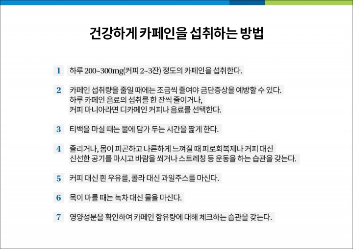카페인 중독이 의심된다고 해도 하루아침에 카페인 섭취량을 줄이기는 어려운 것이 현실이죠. 신체에 긍정적인 영향을 줄 만큼의 카페인을 섭취하되 중독을 피할 수 있도록 건강한 카페인 섭취 방법을 익히는 것이 매우 중요하다고 합니다.