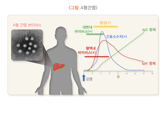 다른 바이러스간염에서와 같이 A형간염도 발열, 식욕부진, 구역, 전신 쇠약감 등의 일반적인 증상으로 시작합니다. 일반적인 치료에도 불구하고 증상이 나아지지 않고, 황달 등의 간염의 특징적인 증상들이 발생할 때는 의사의 진료를 받는 것이 좋습니다.