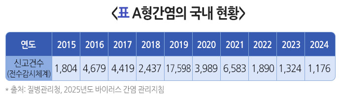 A형감염은 대부분 공중위생 상태가 나쁜 경우 잘 생깁니다. 위생 수준이 열악했던 1960~70년대에는 어린이들이 이 병에 걸려 자연적으로 면역이 형성되어, 성인에서 발생 빈도가 매우 낮았습니다. 그러나 최근에는 위생수준 향상으로 소아기 감염이 거의 없어지게 되었고, 대신 20~40대 성인 연령층에서의 발생 빈도가 급격하게 증가하고 있습니다. 즉, 위생 상태 불량으로 인한 후진국형 유행 양상에서 선진국형 양상으로 변모된 것입니다. ‘감염병의 예방 및 관리에 관한 법률’에서 A형간염을 제2급 감염병으로 지정함에 따라 질병관리청에서는 이 질환을 전수 감시하기 시작하였습니다.