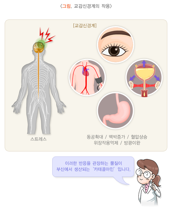 스트레스를 받으면 우리 몸에서는 교감신경계가 활성화되어 심박동과 호흡이 빨라지고, 혈관이 수축하며, 위장관의 움직임이 저하되고, 방광이 이완되는 등 위급한 상황에 대처할 준비를 합니다. 이러한 반응을 유발하는 것이 부신 또는 부신 밖 교감신경절에서 합성되는 카테콜아민입니다. 카테콜아민은 알파 아드레날린 수용체를 자극해 혈압을 올리고, 심근 수축력을 증가시키며, 글리코겐을 분해해 포도당을 생합성하고, 내장을 이완시킵니다. 또한 베타 아드레날린 수용체를 자극해 심박수와 심근 수축력을 증가시킵니다. 카테콜아민이 과다하게 분비되면 두통, 발한, 가슴 두근거림 등이 나타날 수 있습니다.