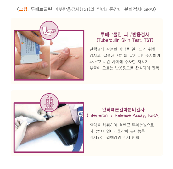 2) 인터페론감마 분비검사 (Interferon-gamma releasing assay, IGRA) 인터페론감마 분비검사는 혈액 검사를 통해 과거 결핵균에 감염된 적이 있는지를 확인하는 방법으로, 한 번의 검사로 비교적 빠른 시간에 진단이 가능하므로 피부 반응 검사에 비해 편리하고 정확합니다. 아울러 잠복 결핵 감염을 진단하거나, 미생물 검사에서 결핵균이 나오지 않은 결핵 의심 환자를 진단하는 데 도움이 될 수 있습니다. 반면 활동성 결핵과 잠복결핵감염을 구별할 수는 없고, 과거에 결핵 치료를 받고 완치된 경우에도 양성으로 나타날 수 있어 검사 결과를 해석할 때 조심해야 합니다. 또한 비싸다는 단점이 있습니다.